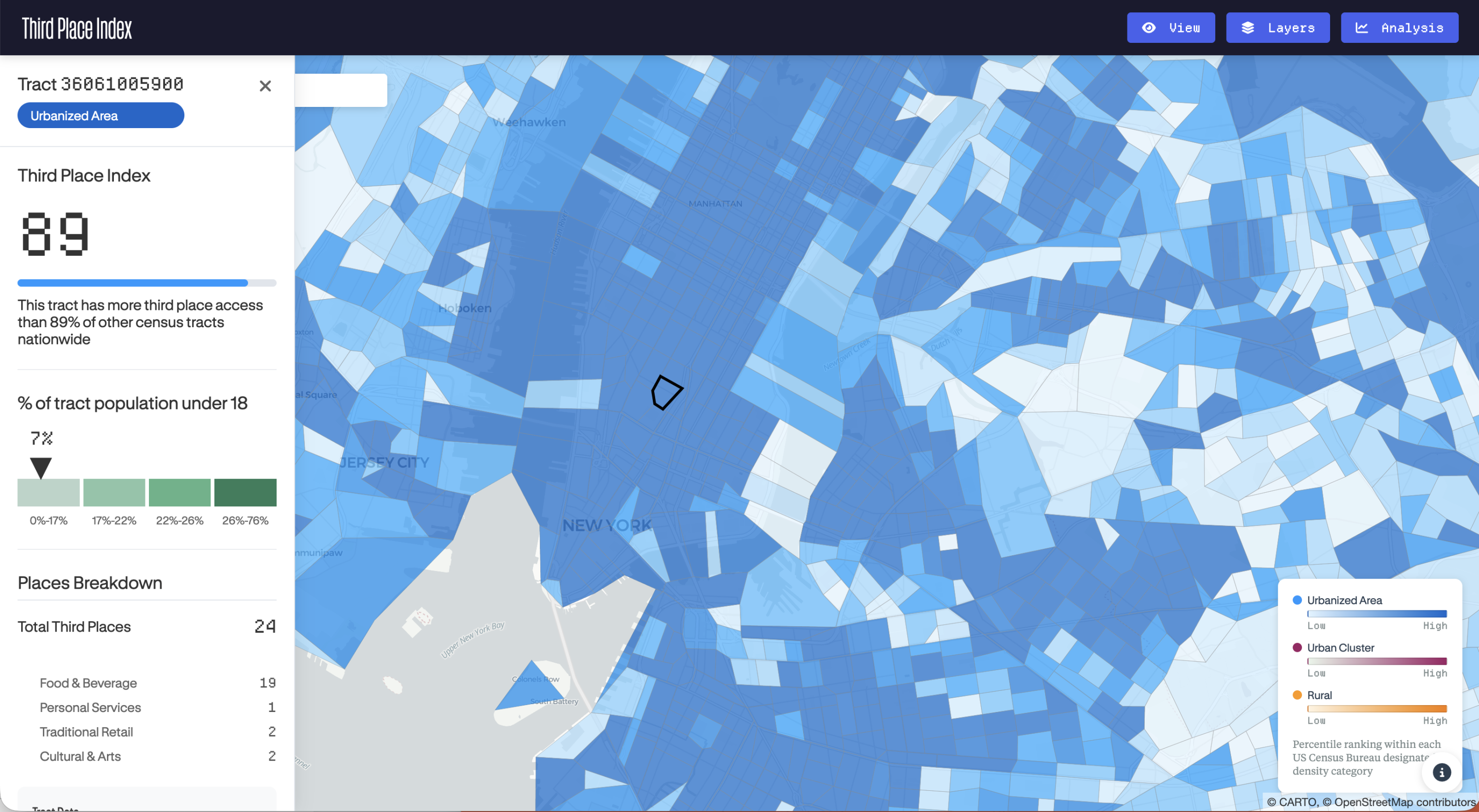 This project looks at Third Place access in America, with a focus on families with children. This is a data journalism project in the format of an interactive article. By using data from OpenStreetMaps and the US Census Bureau, I developed a Third Place Index dataset to compare access to third places on the census tract level.