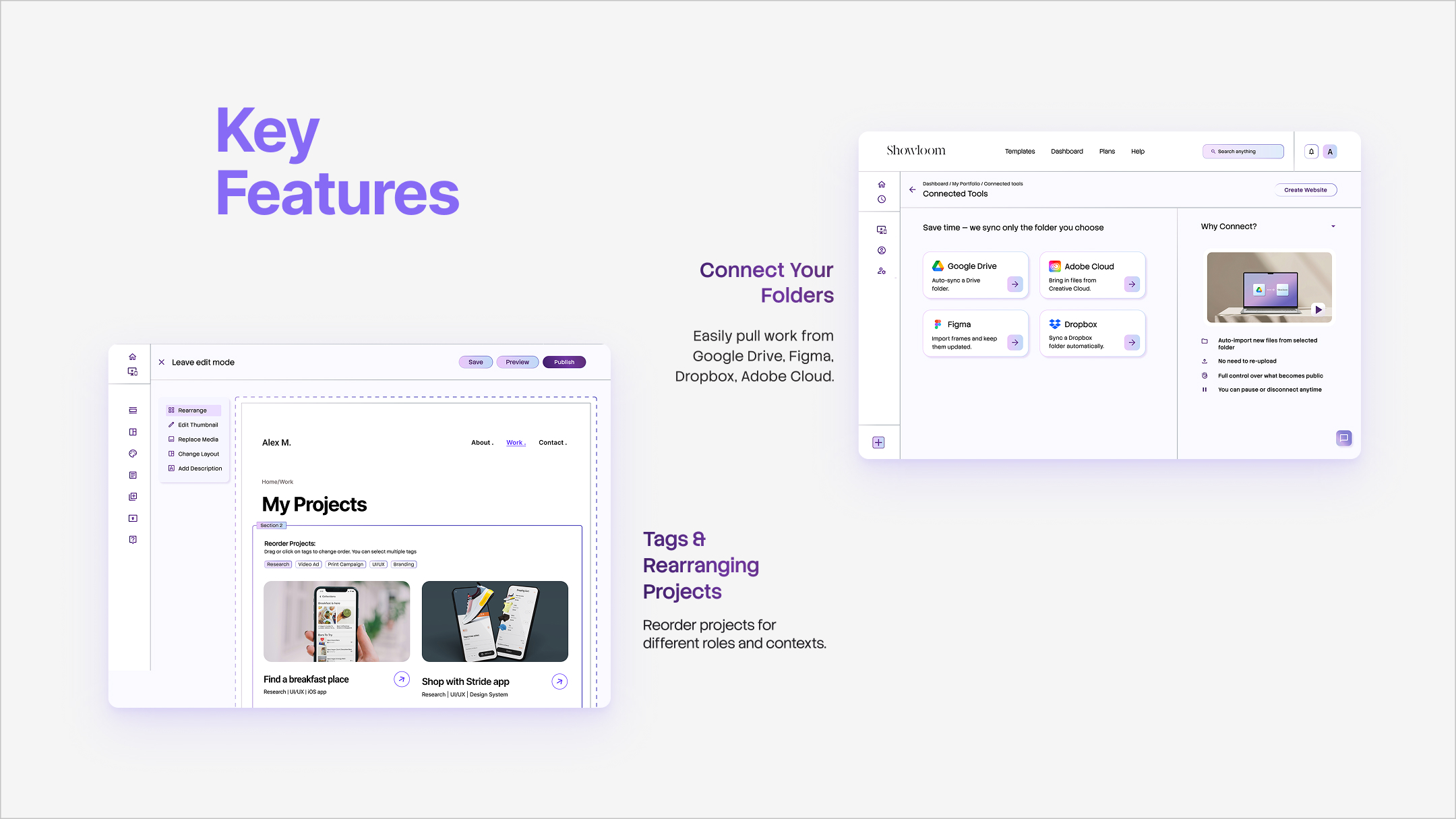 Showloom is a portfolio builder designed for creative professionals who struggle to keep their portfolios updated, organized, and presentation-ready over time. Through user research, I found that the biggest challenge isn’t creating a portfolio, but maintaining it amid time constraints, emotional friction, and scattered files. Showloom addresses this by enabling low-effort updates through cloud integrations, structured templates, and AI-assisted content that keeps users in control. The result is a living portfolio system that supports continuous growth, confident storytelling, and long-term engagement.