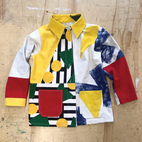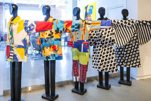 Now, Grimm works almost exclusively with recycled textiles, found fabrics scavenged from their neighborhood or sourced from castoffs. The constraint has become generative. Each new piece is a puzzle defined by what is available, a negotiation between intention and limitation. The practice reflects not only environmental awareness but also a philosophical stance: that textiles carry histories, that reuse is both ethical and poetic.