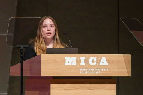 “Transferring to MICA was a turning point in my artistic practice,” Ozga told the audience. “It gave me the resources, trust, and interdisciplinary environment to turn my ideas into reality. Not just individual projects, but a practice that connects art, science, and entrepreneurship.”