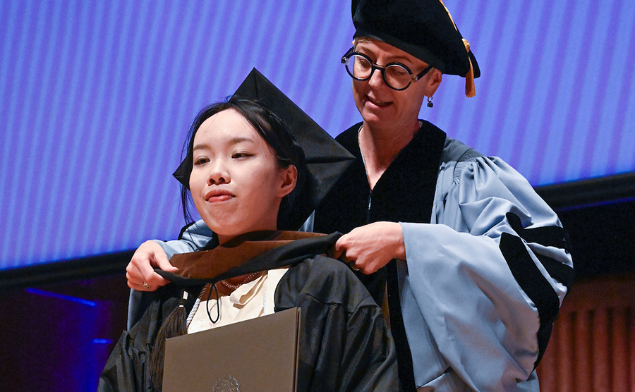 A graduation cap is a sign of the freedom of scholarship which endows the wearer with responsibility and dignity. Rather than mortarboards, a black velvet beret has been traditionally worn as the cap by graduating students at MICA since the 1960s.