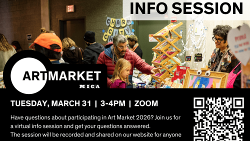 Interested in Art Market 2026? Join our virtual info session on Tuesday, March 31, 2026, from 3–4 PM to learn about participation requirements and how to prepare. Bring your questions! A recording will be available on our website for those who can’t attend live. This session is intended for current MICA students.