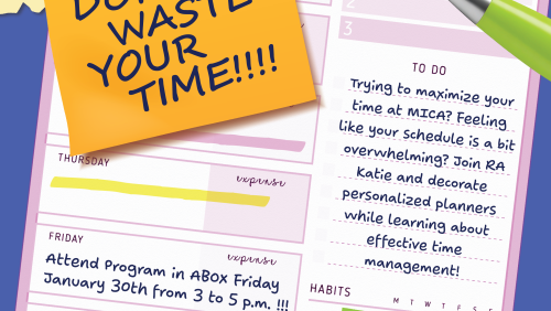 Trying to maximize your time at MICA? Feeling like your schedule is a bit overwhelming? Join RA Katie and decorate personalized planners while learning about effective time management! Materials and snacks provided.