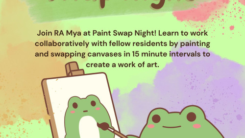 Join RA Mya at Paint Swap Night! Learn to work collaboratively with fellow residents by painting and swapping canvases in 15 minute intervals to create a work of art.